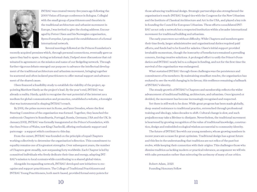 It is with immense pride that we mark the occasion of the twenty-fifth anniversary of the founding of INTBAU. For a quarter of a century, our network has been a beacon for traditional building, architecture, and urbanism, championing a more humane, sustainable, and culturally rich built environment for people around the world.