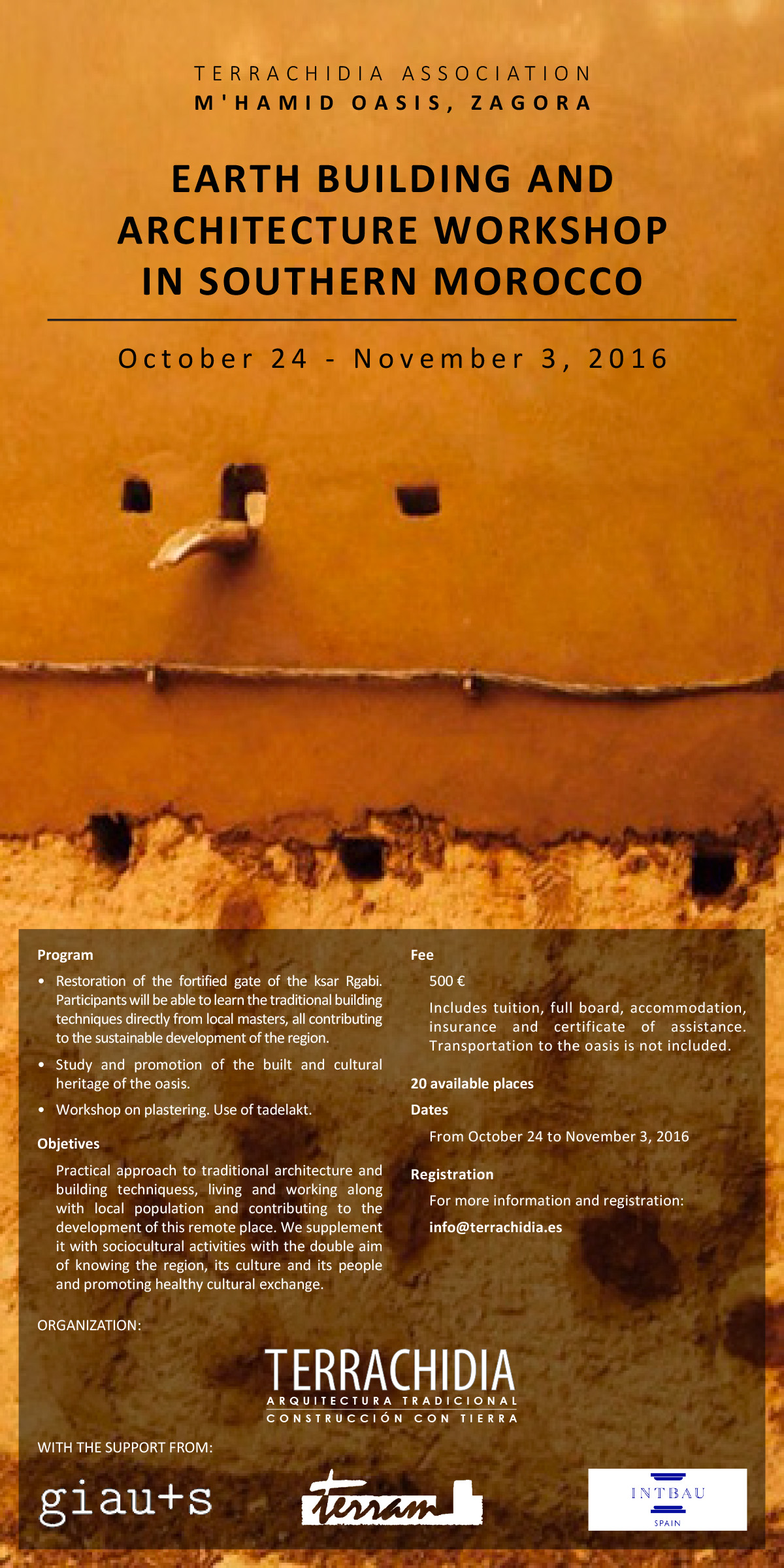 The 14th Earth Building and Traditional Architecture Workshop in the South of Morocco will take place at the Oasis of M’hamid from 24 October to 3 November, 2016.
