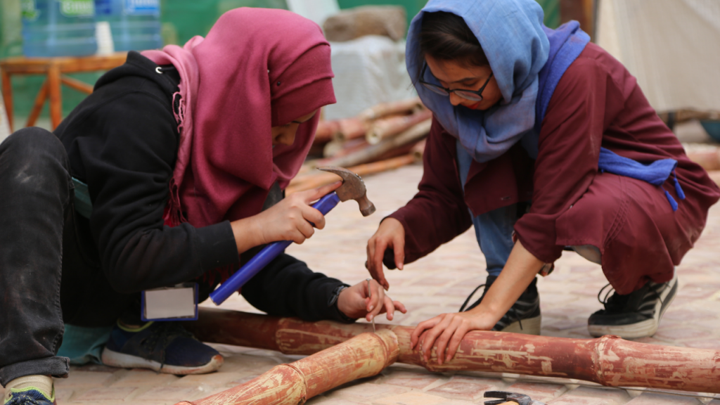 A group of female students from Bangladesh, Pakistan and the UK will build a bamboo structure on Granary Square from 21-23 May 2022. The structure will be enclosed with textiles stitched by the Dumfries House Sewing Bee based in East Ayrshire, Scotland, and decorated with tapestries crafted by female artisans from Bangladesh and Pakistan.