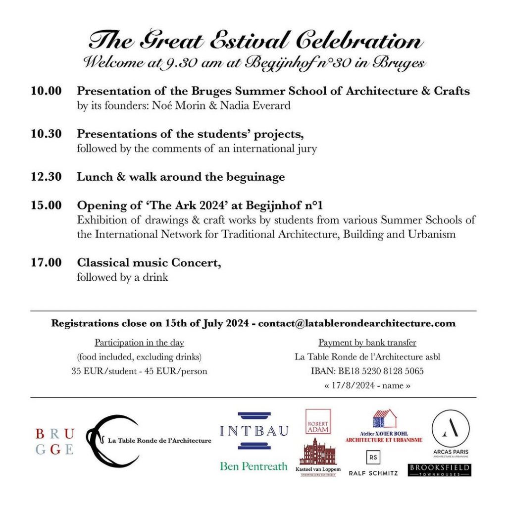 In keeping with tradition, the 2024 Bruges Summer School of Architecture & Crafts will conclude with its iconic Great Estival Celebration. This year, the city of Bruges is generously opening the doors of its historic beguinage to welcome our students, members, INTBAU chapters, and friends from the broader network.