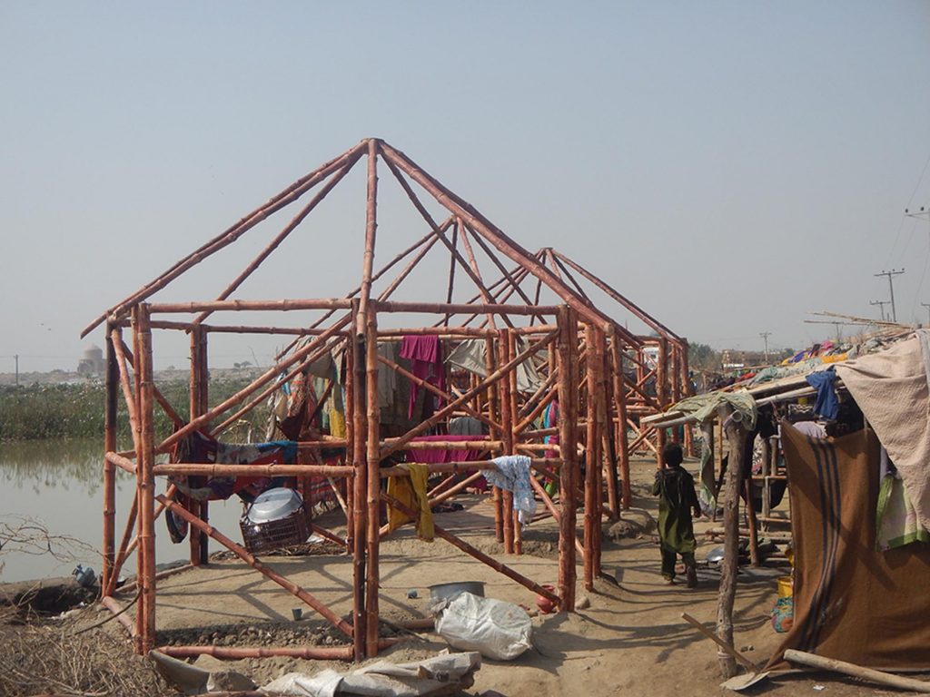 Seismic resistant shelter under construction in Makli with bamboo cross bracing called the ‘Lari Octa-Green’ unit.