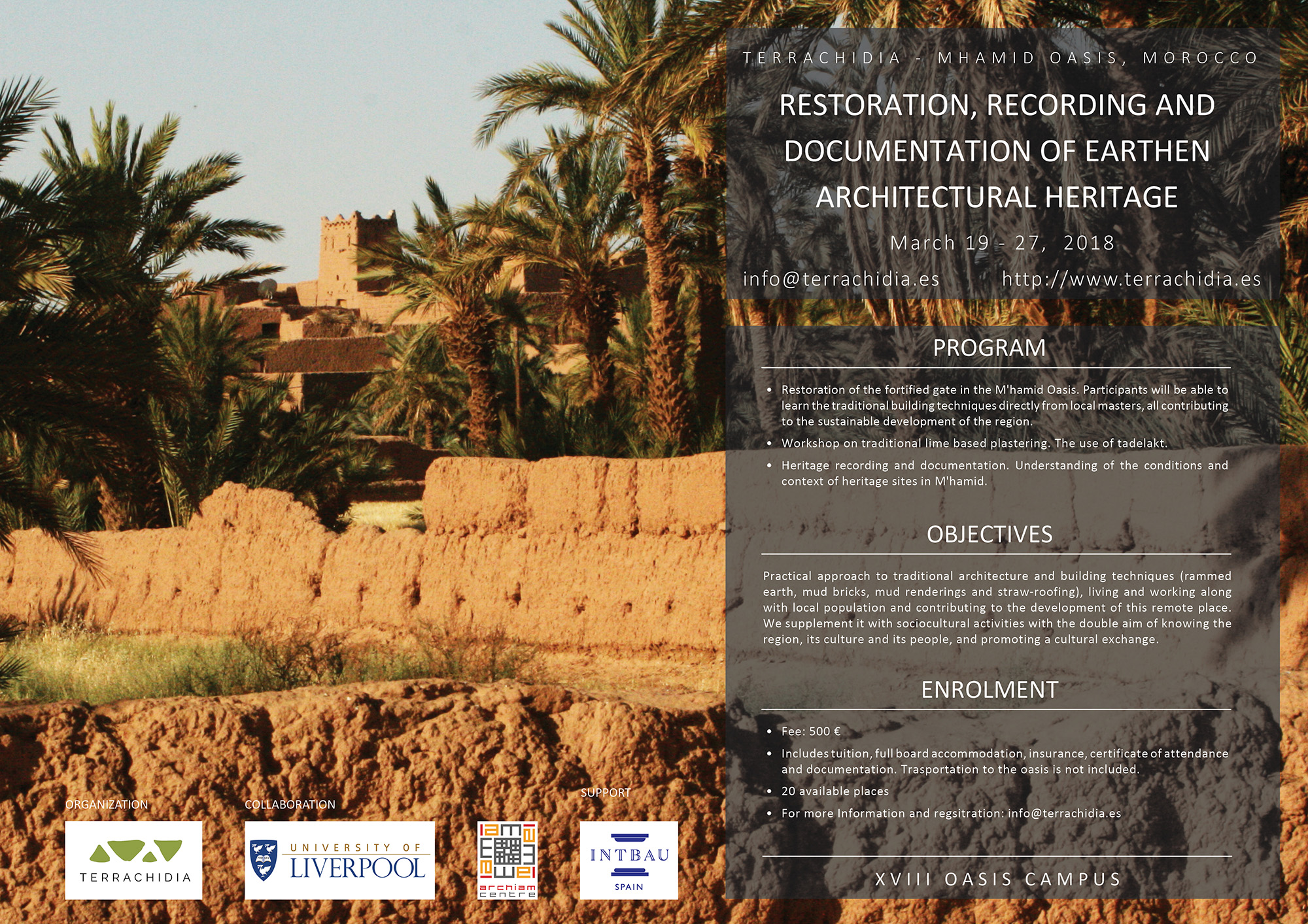This time the main fortified gate of a ksar will be restored. As always, participants will be able to learn the traditional building techniques of Southern Morocco directly from local masters and put these techniques into practice in the restoration of the architecture of this oasis, all contributing to the sustainable development of the region. At the same time, they will work in researching, recording, documentation and promoting this heritage and local architecture.